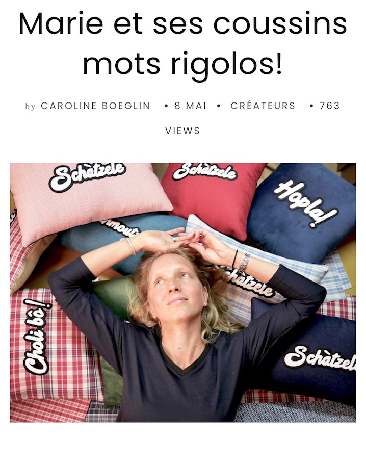 Marie Froehlicher est tapissière décoratrice à Strasbourg. En mars 2020 elle imagine des coussins fun et décalés pour nous permettre d’assumer dans notre déco notre attachement aux traditions alsaciennes: la marque Gotfertomi, elsassichi Quälitat est née!