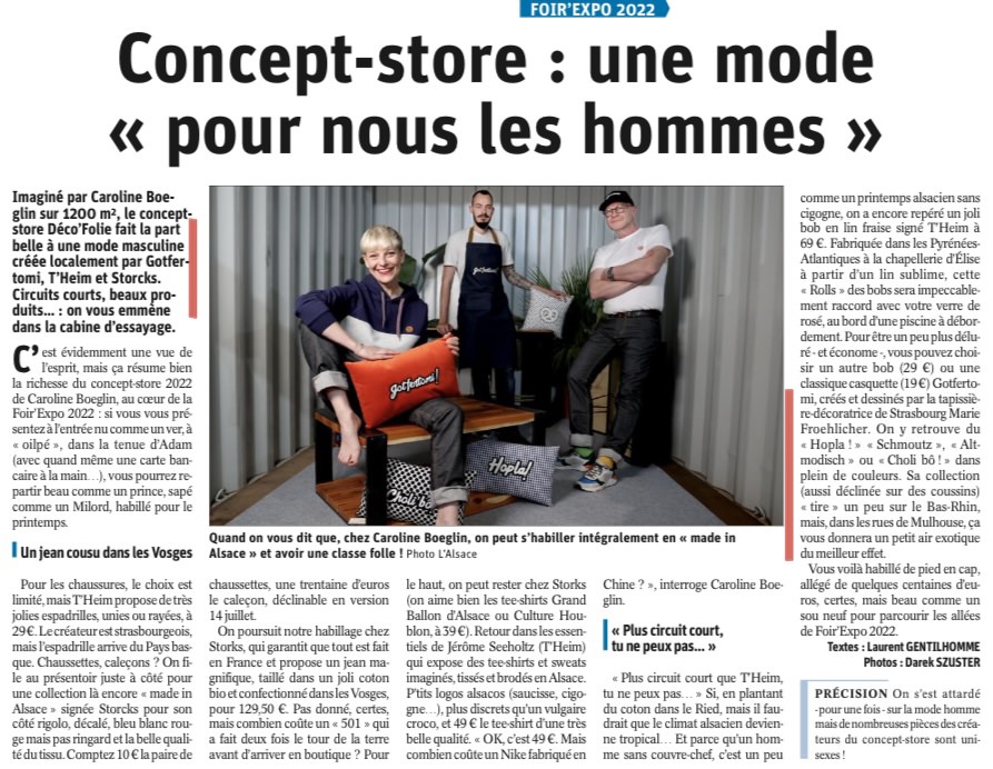 Gotferto-mi, créés et dessinés par la tapissie-re décoratrice de Strasbourg Marie Froehlicher. On y retrouve du « Hopla! » « Schmoutz », « Alt-modisch » ou « Choli bô ! » dans plein de couleurs. Sa collection (aussi déclinée sur des coussins) « tire » un peu sur le Bas-Rhin, mais, dans les rues de Mulhouse, ça vous donnera un petit air exotique du meilleur effet.