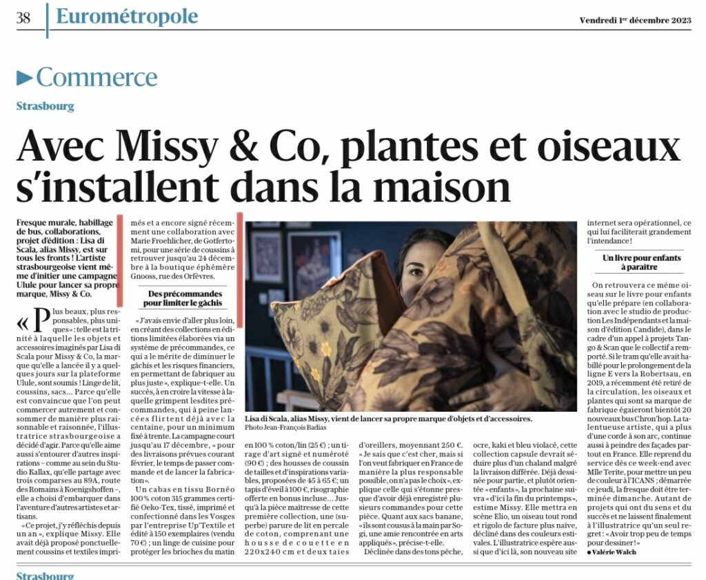 «Ce projet, j’y réfléchis depuis un an », explique Missy. Elle avait déjà proposé ponctuellement coussins et textiles imprimés et a encore signé récemment une collaboration avec Marie Froehlicher, de Gotferto-mi, pour une série de coussins à retrouver jusqu’au 24 décembre à la boutique éphémère Gnooss, rue des Orfèvres.