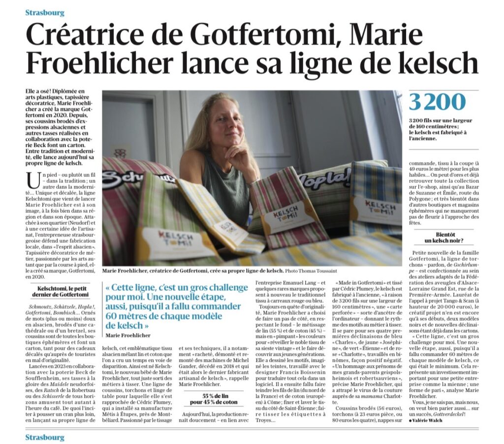 Elle a osé! Diplômée en arts plastiques, tapissière décoratrice, Marie Frochlicher a créé la marque Gotfertomi en 2020. Depuis, ses coussins brodés d’expressions alsaciennes et autres tasses réalisées en collaboration avec la poterie Beck font un carton.