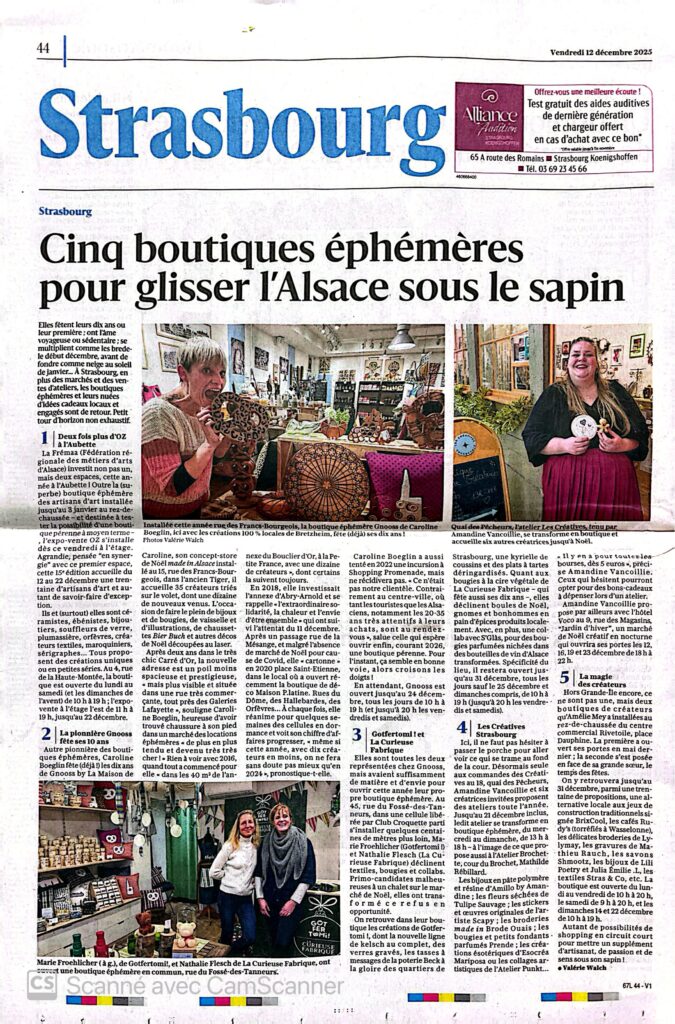 Elles fêtent leurs dix ans ou leur première; ont l’âme voyageuse ou sédentaire ; se multiplient comme les brede-le début décembre, avant de fondre comme neige au soleil de janvier… A Strasbourg en plus des marchés et des ventes d’ateliers, les boutiques éphémères et leurs nuées d’idées cadeaux locaux et engages sont de retour. Petit tour d’horizon non exhaustif.