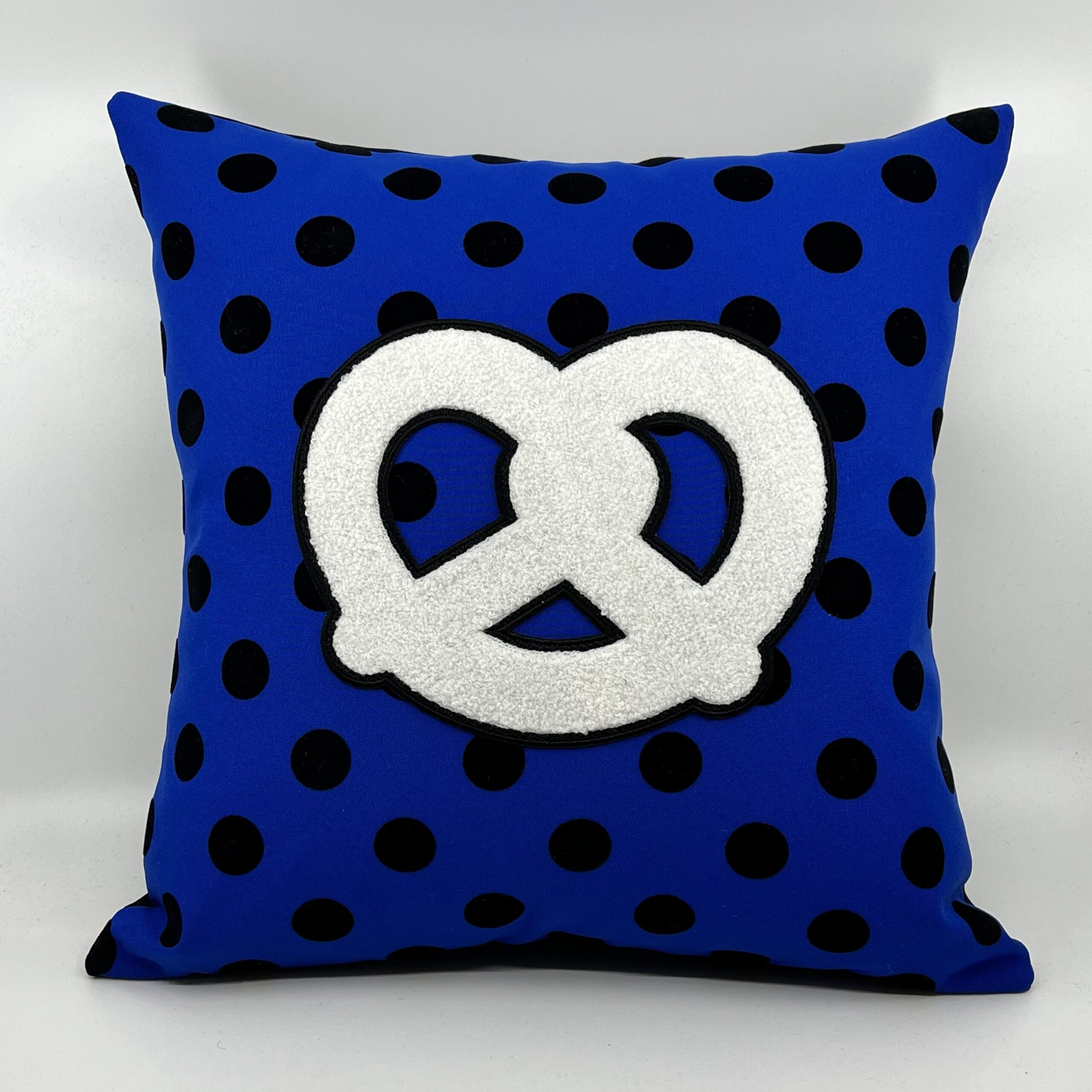 Coussin Bretzel 🥨, Toile bleue, pois noirs.