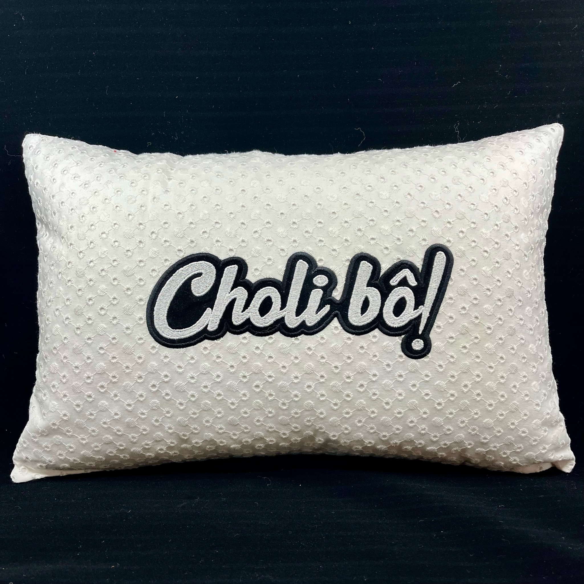Coussin Choli bô ! , broderie Anglaise
