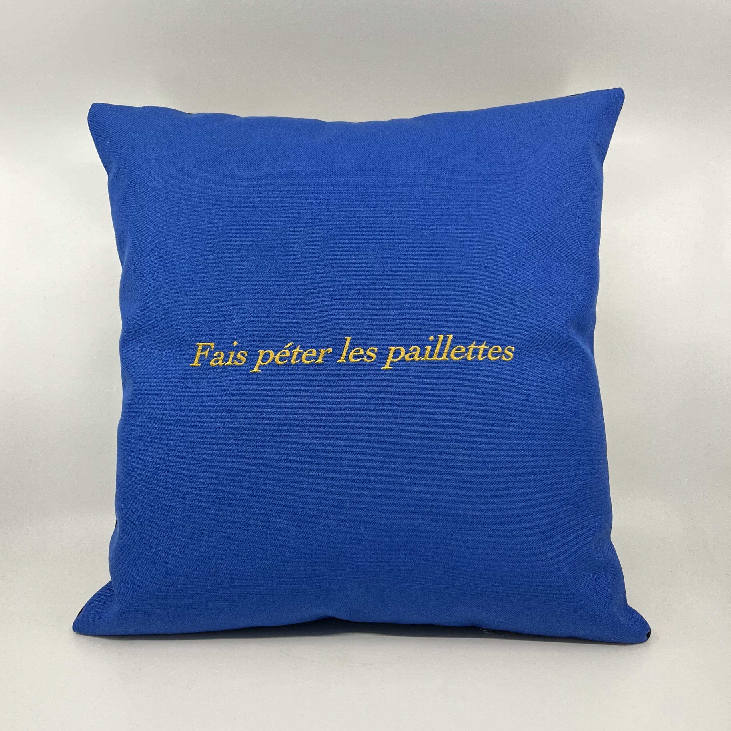 Soyez le premier à laisser votre avis sur “Coussin, « Fais péter les paillettes »Toile bleue”