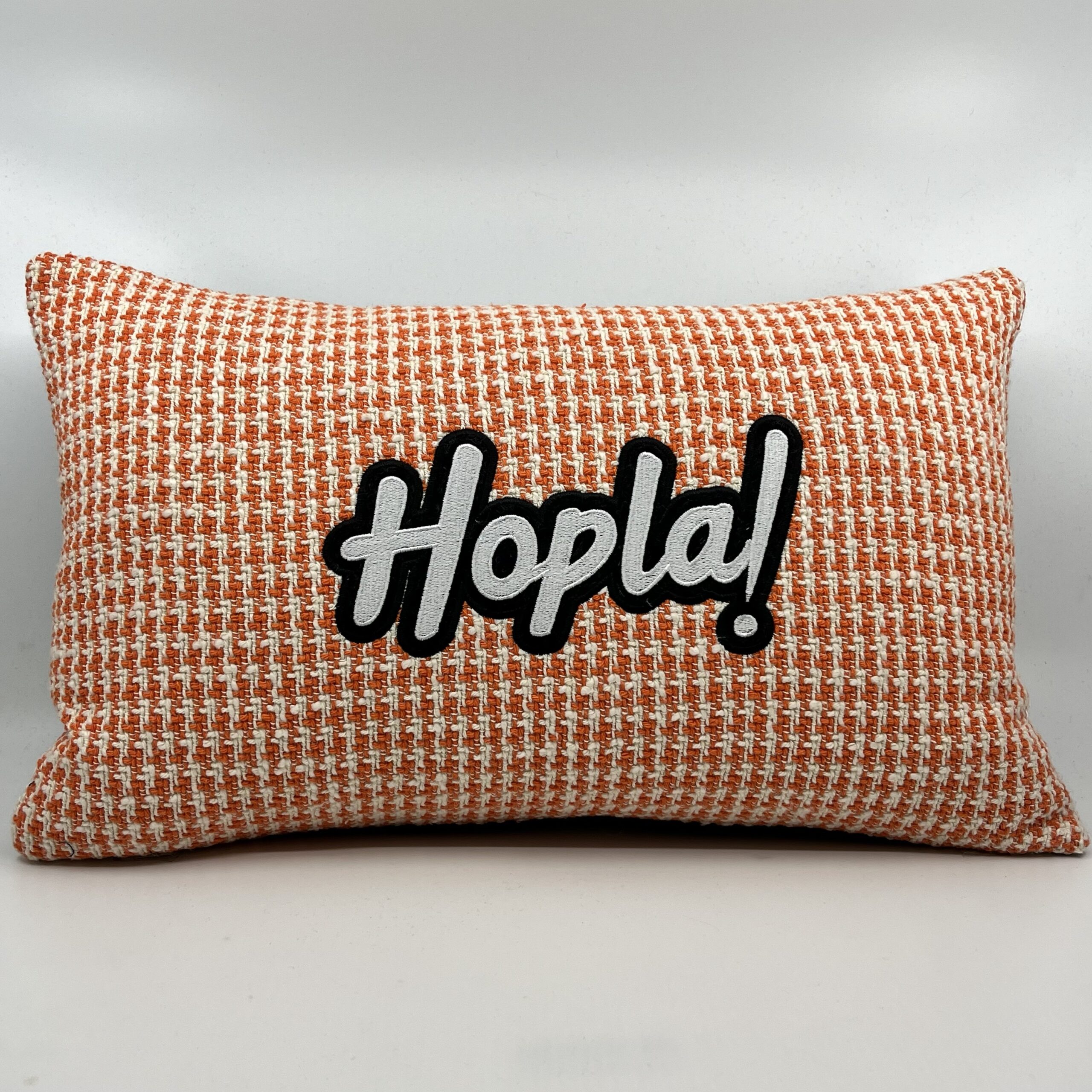 Soyez le premier à laisser votre avis sur “Coussin Hopla !, Trame coton “pied de poule” orange et blanche.”