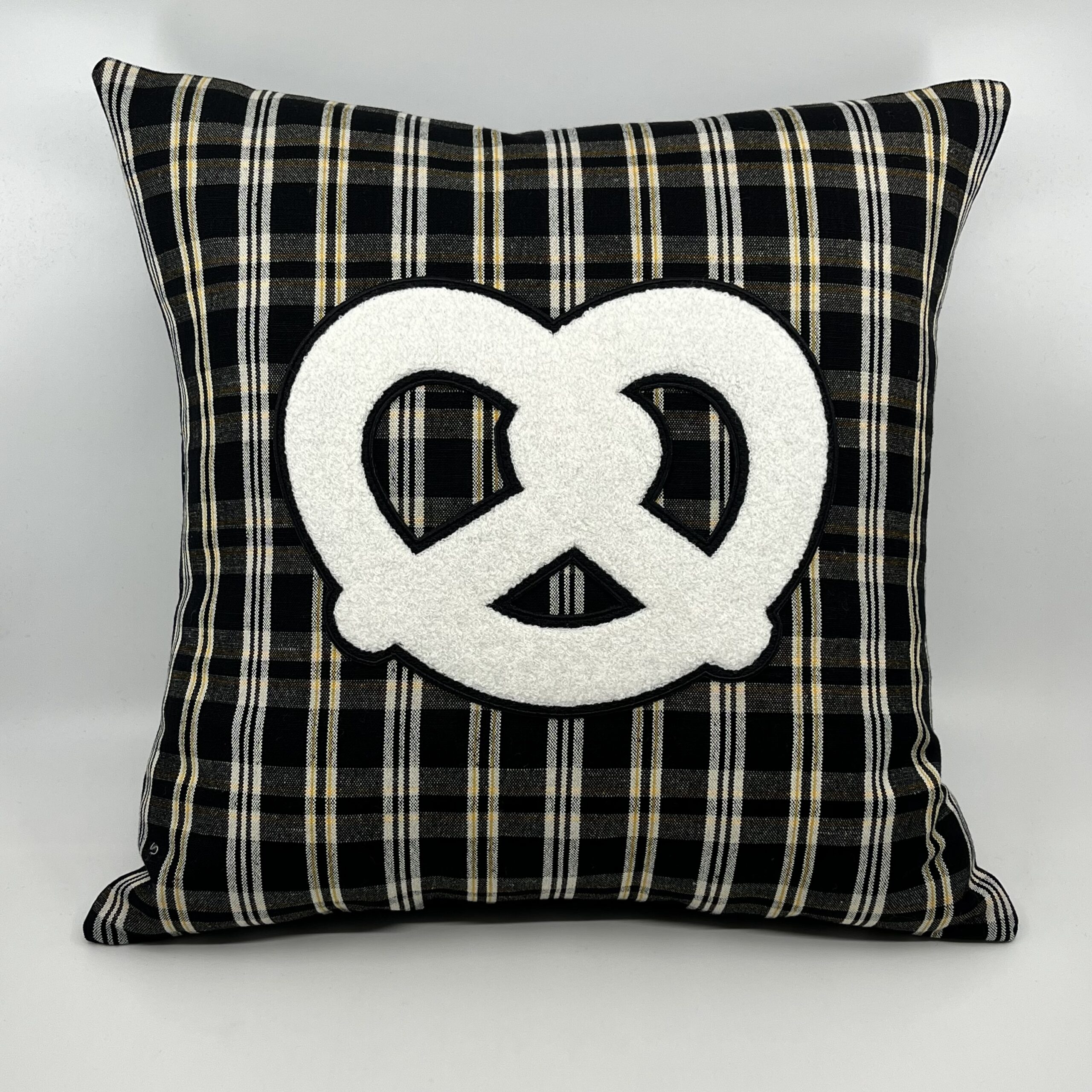 Coussin Bretzel, Kelsch noir et jaune « Émilie ».Coussin Bretzel, Kelsch noir et jaune « Émilie ».