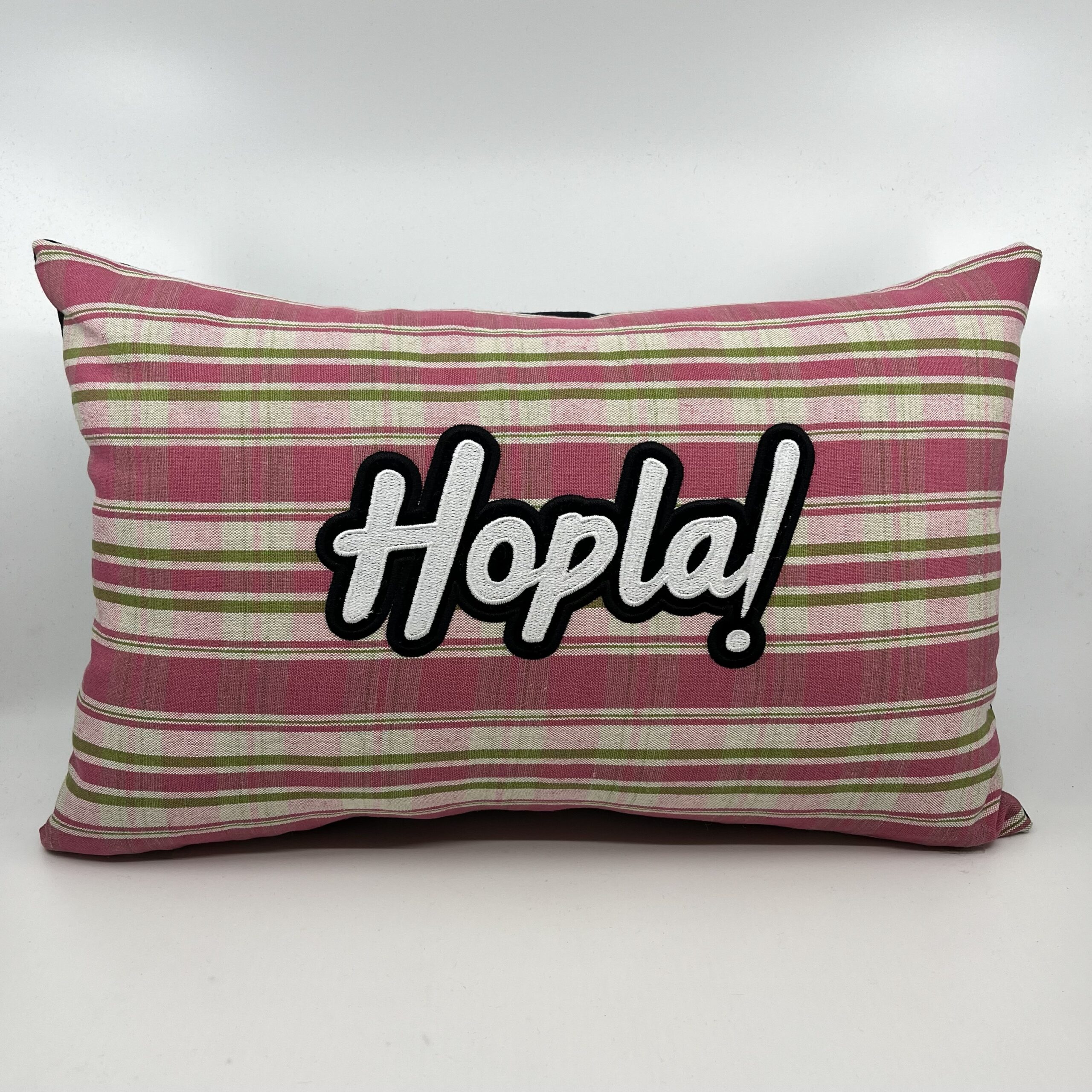 Coussin en kelsch alsacien rose motif hopla!Coussin Hopla ! Kelsch rose «Charlotte»