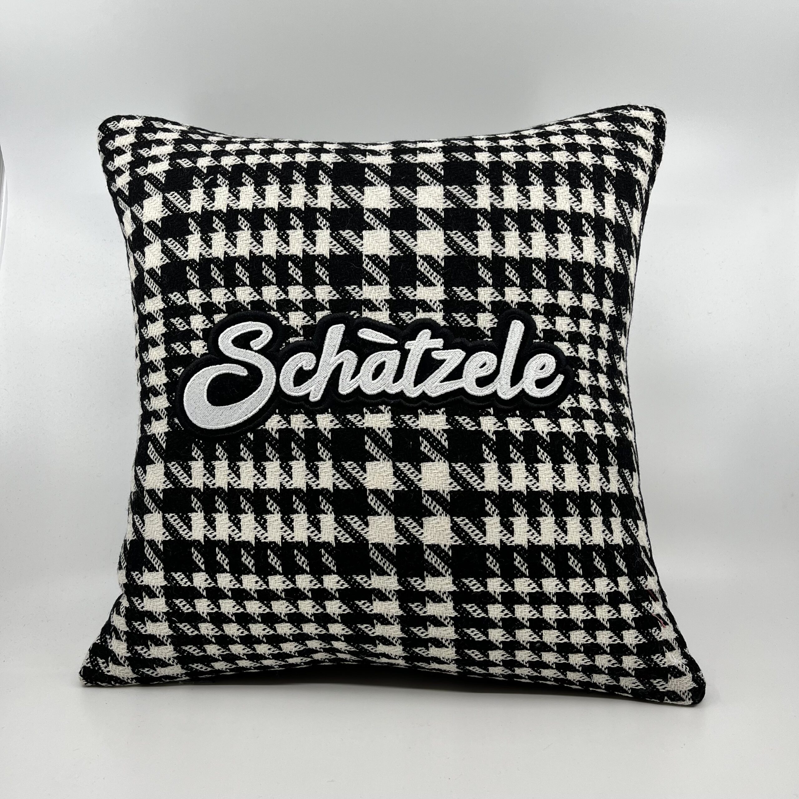 Coussin Schàtzele, lainage noir et blanc.