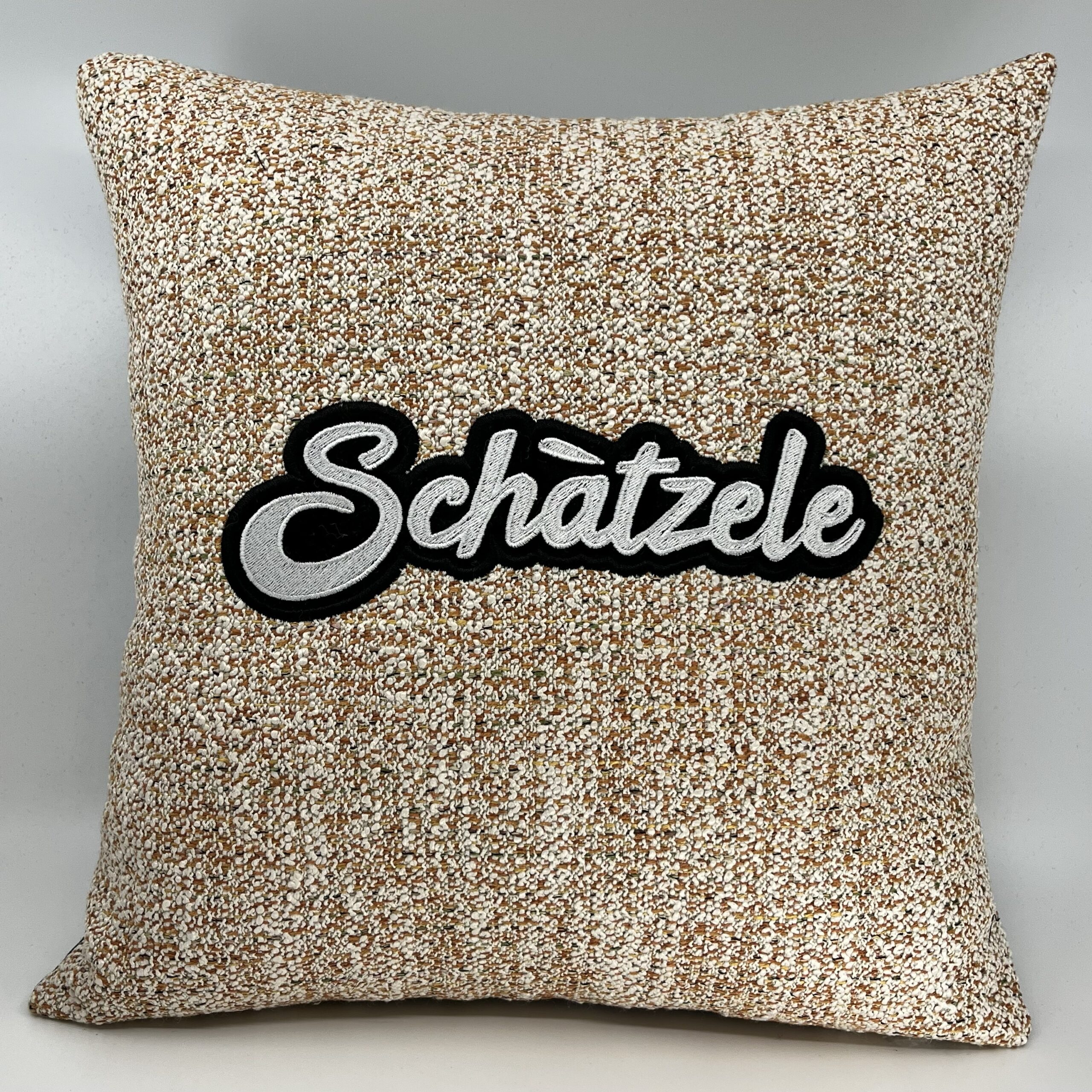Coussin Schàtzele, toile blanche et orange.