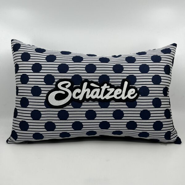 Soyez le premier à laisser votre avis sur “Coussin Schàtzele, Toile gros pois bleus.”