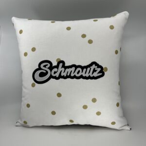 Soyez le premier à laisser votre avis sur “Coussin Schmoutz, toile blanche et pois dorés.”