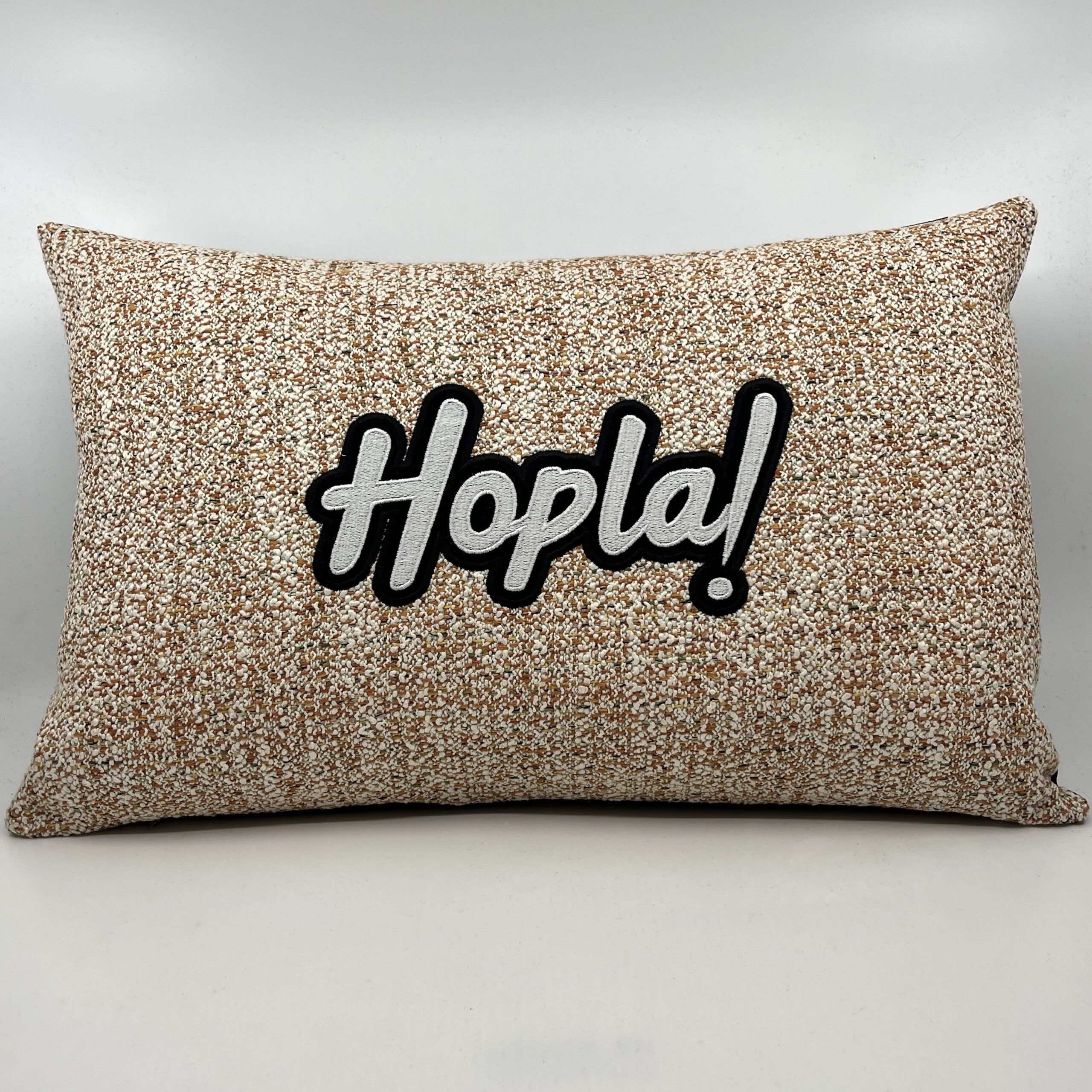 Coussin Hopla ! Toile mouchetée blanche et orange